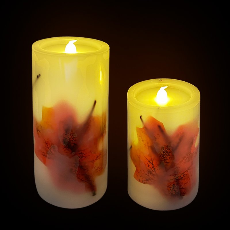 Fill a room with a pleasant glow by displaying these Maple Leaf Motif pillar candles featuring realistic flame effects. From Everlasting Glow.