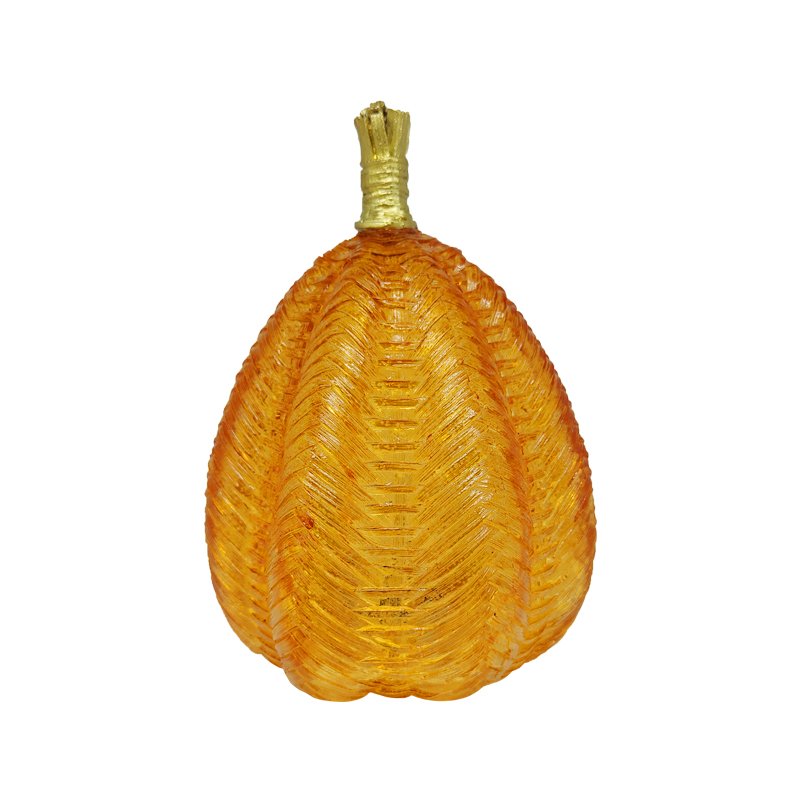 This translucent resin pumpkin has a textured design that catches and reflects the interior light beautifully. Golden accents on the stem give this gorgeous gourd a luxe look.